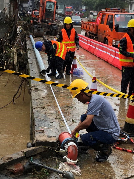 紫金山水厂厂区因强降雨,导致排洪沟无法有效排放,水厂产生大量积水。“险情就是命令,责任就是使命!”水厂职工冒雨开展抢险工作,他们第一时间到阀门井内挖通排污口将积水排出,以最快的速度将险情排除,全力保障城郊片区供水的连续、稳定、安全。
